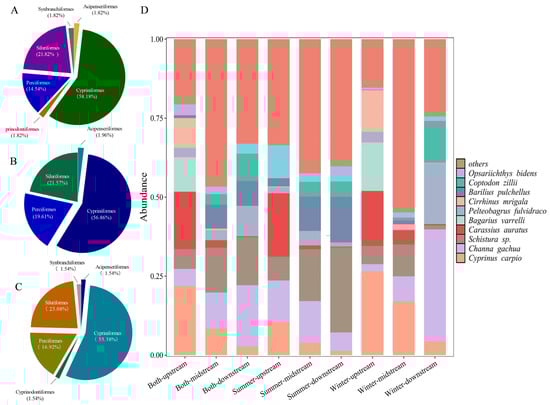 Fish species composition in the Lixian River. (A) Fish composition at the order level during the summer; (B) fish composition at the order level during the winter; (C) fish composition at the order level across both seasons; (D) relative sequence abundance of fish species during the summer, winter, and across both seasons in the upstream, midstream, and downstream reaches.