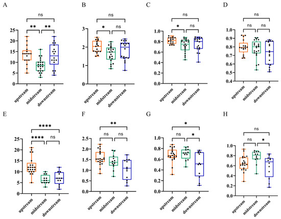 Fish α-diversity in the upstream, midstream, and downstream reaches of the Lixian River. (A–D) Chao1 index, Shannon–Wiener index, Simpson index, and Pielou index during summer; (E–H) Chao1 index, Shannon index, Simpson index, Pielou index during winter. ****: p < 0.0001, **: p < 0.01, *: p < 0.05, ns: non-significance.