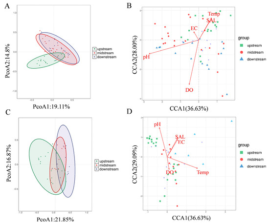 Drivers of fish community spatial patterns and key water quality variables in the Lixian River. (A,B) PCoA analysis results and CCA analysis results during summer; (C,D) PCoA analysis results and CCA analysis results during winter.
