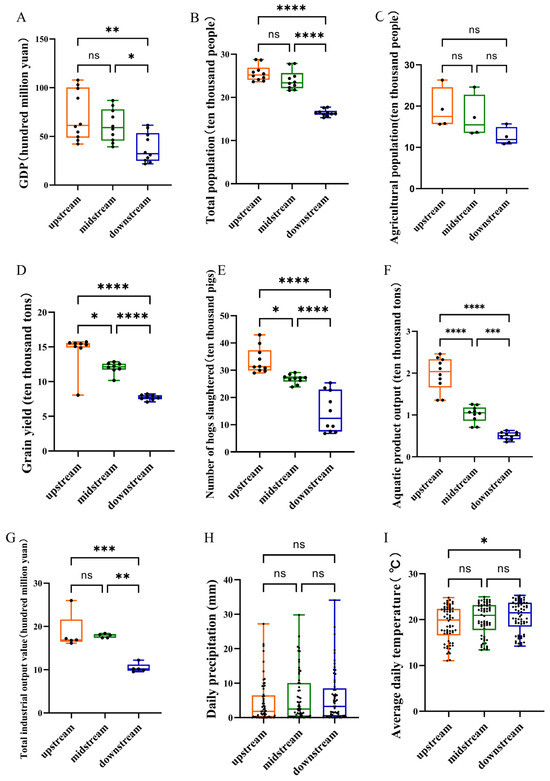 Economic development and climate in the Lixian River. (A) GDP; (B) total population; (C) agricultural population; (D) grain yield; (E) number of hogs slaughtered; (F) aquatic product output; (G) total industrial output value; (H) daily precipitation; (I) average daily temperature. ****: p < 0.0001, ***: p < 0.001, **: p < 0.01, *: p < 0.05, ns: non-significance.