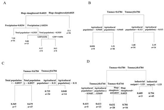 The regression tree analyses were separately conducted for each of the four aforementioned diversity indices (Figure 6). In terms of the Chao1 index, the primary split was defined by the number of hogs slaughtered, followed by precipitation, whereas the Shannon–Wiener index was firstly divided by the maximum temperature (Tmmax) and then by the agricultural population. Similarly, the Simpson index was initially divided by the maximum temperature (Tmmax) and further subdivided by factors such as total population and agricultural population. The primary split of the Pielou index was defined by the maximum temperature (Tmmax), followed by the total industrial output value (industrial output). These results suggested that climatic factors, particularly the maximum temperature, exhibited stronger predictive power compared to human-driven factors. However, the impacts of human-driven factors, such as agriculture and breeding industry, on fish diversity remained significant and nonnegligible.