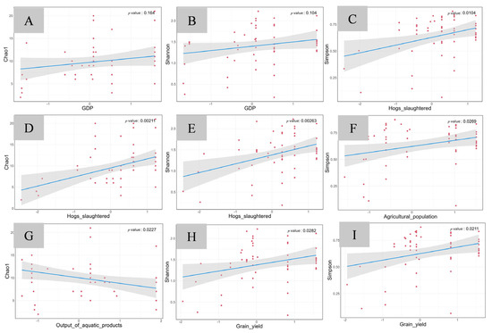 Generalized linear model analysis of fish diversity indices and indicators of economic activities in the group with lower maximum temperature. The horizontal axis represents economic indicator factors, and the vertical axis represents the diversity indices. (A) GDP–Chao1; (B) GDP–Shannon; (C) hogs slaughtered–Simpson; (D) hogs slaughtered–Chao1; (E) hogs slaughtered–Shannon; (F) agricultural population–Simpson; (G) output of aquatic product–Chao1; (H) grain yield–Shannon; (I) grain yield–Simpson.