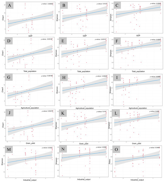 Generalized linear model analysis of fish diversity indices and indicators of economic activities in the group with higher maximum temperature. The horizontal axis represents economic indicator factors, and the vertical axis represents the diversity indices. (A) GDP–Chao1; (B) GDP–Shannon; (C) GDP–Simpson; (D) total population–Chao1; (E) total population–Shannon; (F) total population–Simpson; (G) agricultural population–Chao1; (H) agricultural population–Shannon; (I) agricultural population–Simpson; (J) grain yield–Chao1; (K) grain yield–Shannon; (L) grain yield–Simpson; (M) industrial output–Shannon; (N) industrial output–Simpson; (O) industrial output–Pielou.