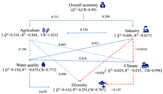 Partial least-squares path model based on the economy, fish diversity, and environment of the Lixian River. Red and blue arrows represent negative and positive impacts, respectively. Solid lines indicate significance (p < 0.05), and dashed lines indicate non-significance (p > 0.05). The HTMT (Heterotrait–Monotrait ratio) values in the PLS-PM model (Table S3) are all less than 0.9, all Q2 values are greater than 0, and all CR (Composite Reliability) values are greater than 0.7, indicating that the model fits well.