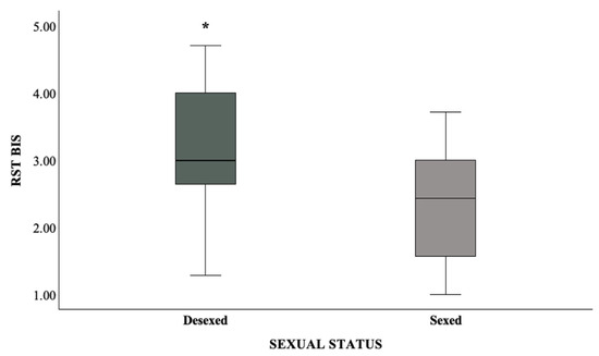 Clustered boxplot displaying BIS scores by sex status (desexed vs. sexed) in the entire sample of dogs (44). * = Independent-samples Mann–Whitney U test, p = 0.008.