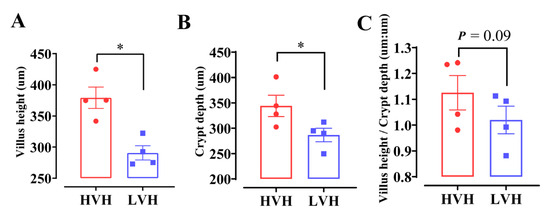 Intestinal morphology of ileum in fattening pig. (A) Villus height; (B) crypt depth; (C) villus height/crypt depth. VH: villus height; N = 4, HVH: high villus height; LVH: low villus height; N = 4, *: p < 0.05.
