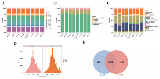 Overview of RNA editing events in ileum tissue under different VH conditions (N = 4). (A) Classification of RNA editing event types. Stacked bars show the proportions of different editing types (e.g., A→C and A→G) in each sample. (B) Classification of single nucleotide variants (SNVs) resulting from RNA editing events. Stacked bar plots illustrate variant types, including synonymous SNVs, nonsynonymous SNVs, stop-gain, and stop-loss events. (C) Genomic region distribution of editing events. Different colors represent various genomic locations, including exonic, intronic, upstream, downstream, and other regions. (D) Classification of RNA editing event frequency. (E) Venn diagram illustrating the intersection of RNA-editing-targeted genes (editing gene). N = 4, VH: villus height; HVH: high villus height; LVH: low villus height.
