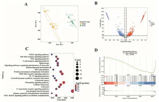 Analysis of ileum RNA editing genes results with different VHs (LVH vs. HVH). (A) Principal component analysis (PCA) of RNA editing frequencies. Each point in the PCA plot represents a biological replicate. (B) Volcano plots indicating differential analysis results at different VH (LVH vs. HVH). The x-axis indicates log2 fold changes, and the y-axis indicates statistical significance (−log10 p-value). Each dot represents a gene or locus: red indicates significant upregulation, blue indicates significant downregulation, and gray represents no significant change. (C) KEGG pathway enrichment analysis. (D) GSEA enrichment analysis: TNF signaling pathway genes were RNA edited higher in HVH. KEGG: Kyoto Encyclopedia of Genes and Genomes; GSEA: gene set enrichment analysis; N = 4, VH: villus height; HVH: high villus height; LVH: low villus height.