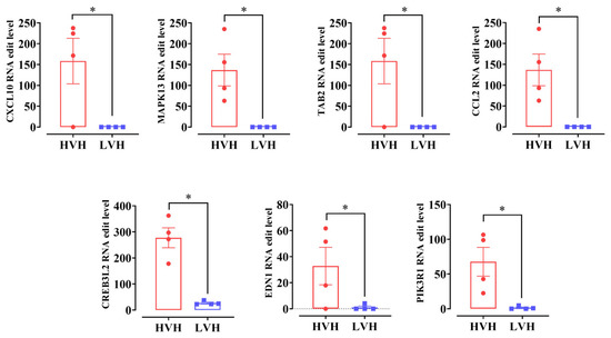 We next examined RNA editing levels in genes related to the TNF signaling pathway via KEGG pathway analysis. We found that these genes (CXCL10: C-X-C motif chemokine 10; MAPK13: mitogen-activated protein kinase 13; TAB2: TGF-beta activated kinase 1; CCL2: C-C motif chemokine ligand 2; CREB3L2: CAMP-responsive element-binding protein 3-like 2; EDN1: Endothelin 1; PIK3R1: Phosphoinositide-3-kinase regulatory subunit 1) exhibited a significantly higher RNA editing level in the high-villus-height (HVH) group compared to the low-villus-height (LVH) group (Figure 4 and Supplementary Table S1). This observational finding suggests that enhanced RNA editing regulation in the HVH group may exhibit potential involvement in promoting intestinal villus cell growth, which could be associated with villus height (VH) development.