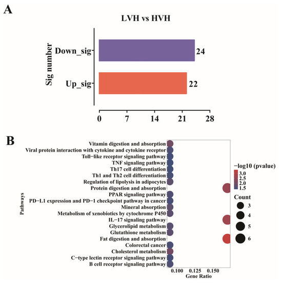 Analysis of ileum RNA gene expression results with different VHs (LVH vs. HVH). (A) Number of differential genes in LVH vs. HVL. (B) KEGG pathway enrichment analysis. VH: villus height; HVH: high villus height; N = 4; LVH: low villus height.
