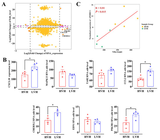 Ileal villus height impacts nutrient absorption. This study stratified crossbred pigs into high and low-villus groups (n = 4) and identified differentially edited genes (REGs) and expressed genes (DEGs) enriched in TNF/IL-17 pathways. Integrative omics revealed that pro-inflammatory genes CXCL10, CCL2, CREB3L2, and PIK3R1 were upregulated but hypomethylated in the low-villus group, highlighting RNA-editing-mediated inflammation regulation of villus development.