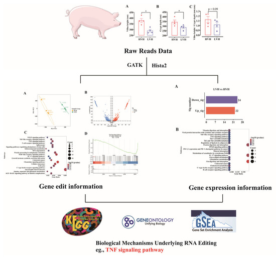 To investigate the RNA regulatory mechanisms underlying differences in villus height, this study performed comprehensive transcriptomic analysis on ileal samples from crossbred pigs (Landrace × Yorkshire × Duroc, DLY) (high-villus group, N = 4; low-villus group, N = 4) collected by our research team. High-throughput RNA sequencing (RNA-seq) combined with the RNA editing detection (RE-seq) computational framework was applied to systematically quantify editing events and conduct differential analysis across large-scale RNA-seq datasets [22]. This study provides novel insights into the role of RNA editing in inflammation-related pathways associated with ileal villus height variation, offering a new perspective for intestinal development and health regulation. As illustrated in Scheme 1, the research framework highlights RNA editing as a promising target for future studies on gut health, paving the way for the development of RNA-editing-based modulators and their biotechnological applications.