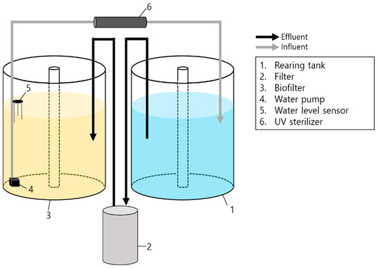 Six FTS and six RAS were each set up in separate 500 L polypropylene circular tanks (diameter 100 cm × height 50 cm; water volume 0.4 m3). The FTS utilized a venturi drainage system, whereas the design of RAS employed in this study is illustrated in Figure 1, which depicts its essential components. The RAS system used in the experiment was designed to function similarly to commercial aquaculture equipment. Each RAS comprised a biological filtration tank, an external filter (20 W, EHEIM classic 600, EHEIM, Deizisau, Denmark), and a UV sterilizer (18 W, UV-A18W, PERIHA, Zhongshan, China). A polynagel sponge (35 ppi, DYnTEC, Seoul, Republic of Korea) was placed inside the external filter to effectively capture the solids. The filter was maintained weekly to ensure optimal performance. This schedule was chosen to balance labor efficiency and system performance. Daily maintenance was considered but found impractical due to resource limitations. Additionally, our trials indicated that weekly cleaning did not significantly impact the water quality or led to substantial leakage and potential release of captured solids. The cleaning cycle was configured to a duration that did not impact the flow rate. The biological filtration tank housed 100 L of fluidized bed filter medium (TK1, TaeJin Engineering, Busan, Republic of Korea) aged for over a month. A union hose facilitated continuous floating of the filtered media. To maintain water circulation, a 15 W pump directed water through the UV sterilizer and back into the rearing tank. An electrode-type automatic water level sensor (YQ-5000, Youngjin, Republic of Korea) was integrated with the pump, ensuring a consistent water level in both the rearing and filtration tanks.