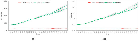 Significant interactions between aquaculture systems and feed types were found in TAN and NO2-N (p < 0.05). In the RAS group, TAN and NO2-N were significantly higher than the FTS group, averaging 1.00 ± 0.64 and 0.757 ± 0.464 mg/L (p < 0.05). When utilizing paste feed, concentrations resulted in higher TAN (0.859 ± 0.651) and NO2-N (0.485 ± 0.502 mg/L), respectively, compared to floating extruded pellet (p < 0.05). Electrical conductivity and TDS increased over time in the RAS experimental group (Figure 2). Nitrate nitrogen was maintained at an average of 4.17 ± 0.31 mg/L in the FTS experimental group, but exhibited a steady increase in the RAS experimental group (302 ± 33 mg/L, Figure 3).