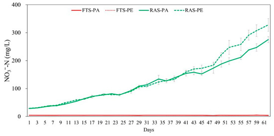 The 62-day experiment was conducted without water exchange in RAS to observe changes in water quality. While exchanging water would have a positive effect on the water environment for the experimental fish, it would also result in changes in nitrate accumulation and other water quality parameters. This approach was chosen to simulate conditions that might be encountered in commercial-scale RAS, wherein water conservation is a key consideration and the accumulation of substances over time must be managed effectively. Water was added in RAS only to replace the amount lost through evaporation. The water refreshment rate in FTS was set to 1.7 L/min. Groundwater, filtered through a 5 μm microfilter (PP filter, Human Science Co., Ltd., Hanam, Republic of Korea), was utilized in all experimental tanks.