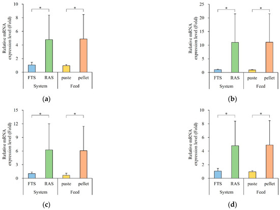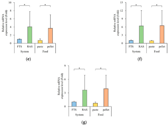 Middle gut samples from five randomly selected fish in each tank were collected, promptly frozen, and preserved at −80 °C, until further analysis. RNA extraction from the eel samples was carried out using an RNase mini kit (QIAGEN, Hilden, Germany) following the manufacturer’s protocol. Subsequently, cDNA was synthesized using the M-MLV cDNA Synthesis Kit (enzynomics, Daejoen, Republic of Korea).