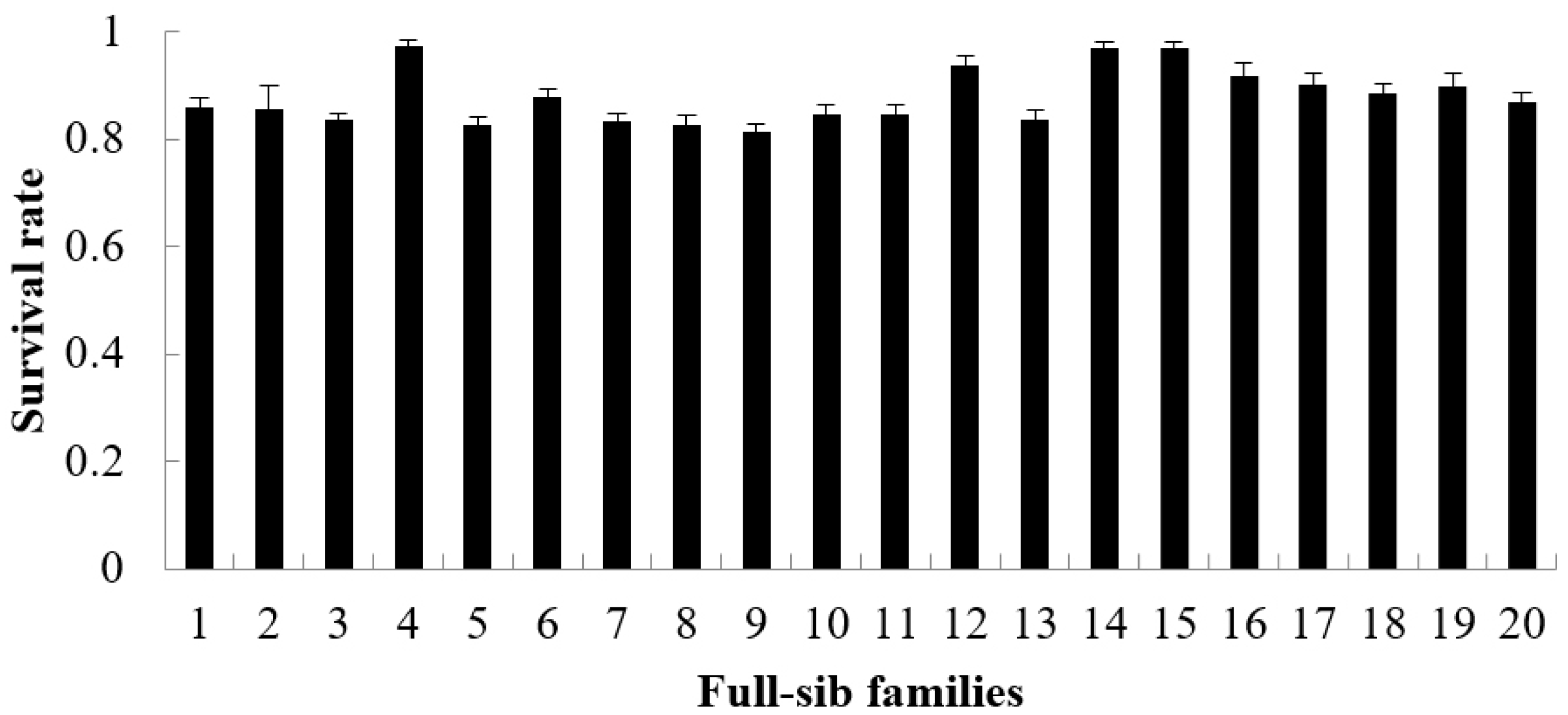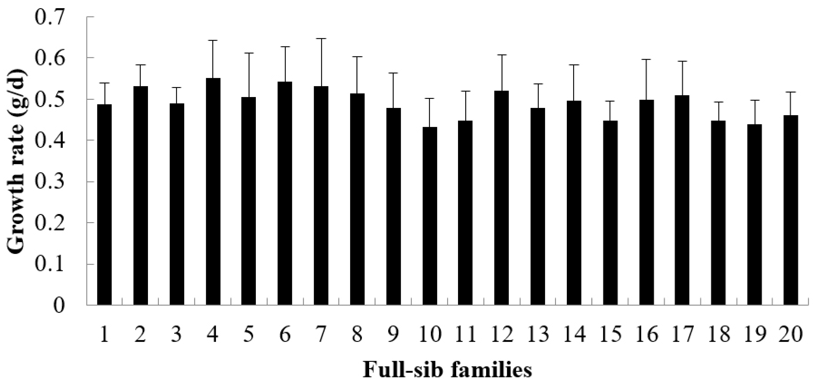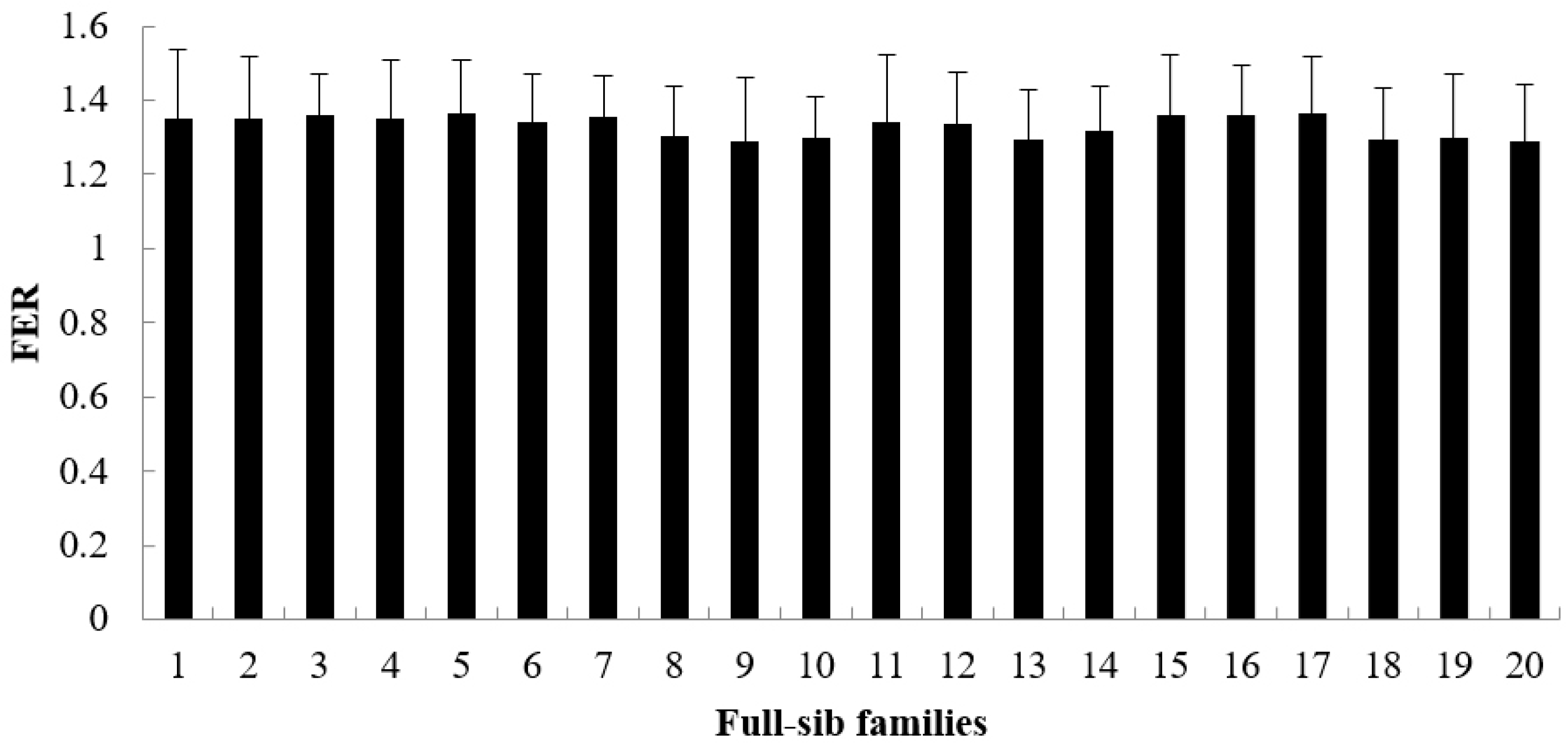 The growth rate, survival rate and FER are showed in Figure 1, Figure 2 and Figure 3. During the period from 3 to 6 months of age, the growth rate values of 20 families ranged from 0.4327 to 0.5511 (Figure 1), the survival rate values ranged from 0.8135 to 0.9727 (Figure 2) and the FER values ranged from 1.2886 to 1.3635 (Figure 3). The Shapiro–Wilk normality test verified that all datasets followed a normal distribution.