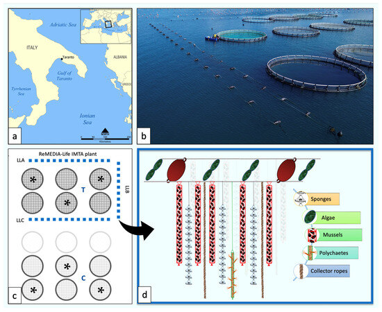 The REMEDIA Life IMTA system: (a) Geographic location of the IMTA system in the Northern Ionian Sea (Mar Grande of Taranto, Southern Italy); (b) aerial photograph of the “Maricoltura Mar Grande” facility and IMTA system; (c) map of the IMTA facility showing the position of the three long lines (LLA, LLB, and LLC) and the two areas: T (treatment) and C (control); (d) drawing of the long lines with the bioremediator organisms on the vertical collectors. The asterisk indicates the cages from which the fish were sampled for the treatment and control groups.