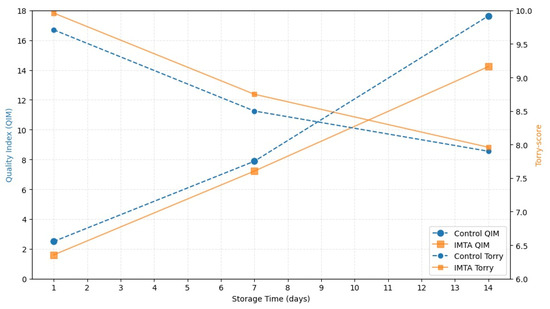For both rearing systems, the end point values registered on day 14, although significantly lower in comparison with day 1, fall within the range of fish quality acceptability. For the IMTA rearing system, the intersection point between the QI and Torry methods was found at day 10, that is, one day later as compared to the control group, evidencing the effectiveness of the IMTA method in prolonging and improving overall fish quality.