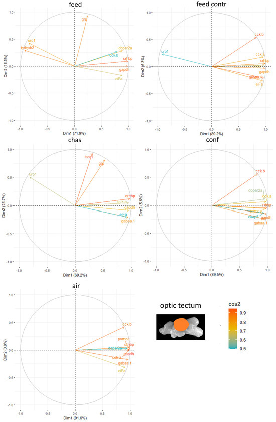 ox was found to be changed only in the optic tectum, where it was increased in confined fish and decreased in chased animals. The detailed visualization and description of the expression patterns for this brain part can be found in