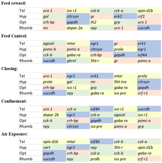 Overview of the gene expression profiles of appetite-related genes in the telencephalon (tel), hypothalamus (hyp), optic tectum (opt), and rhombencephalon (rhomb) of male zebrafish 0, 30, 60, and 90 min after the treatment, whereby feed-rewarding, feed-control treatment, chasing, confinement, and air exposure were used as stressors. N = 6 per treatment. The significance value p < 0.05 was calculated from the Bayes models performed on the log2 values of the normalized gene expression values; yellow = not changed, red = down-regulated, green = up-regulated.