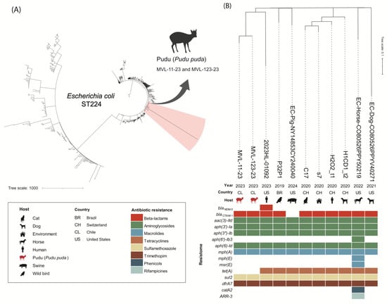 Phylogenomic analysis and comparison of Escherichia coli ST224 from infected wound and intracardiac blood samples isolated from southern pudu and closely related genomic sequences available in the Enterobase database. (A) Phylogenomic analysis of 737 genomes of E. coli ST224, highlighting the clade that includes strains isolated from the southern pudu. (B) Detailed view of the highlighted clade containing E. coli ST224 from southern pudu and closely related genomic sequences (fewer than 100 SNPs of difference) with comparison of epidemiological data and resistome.