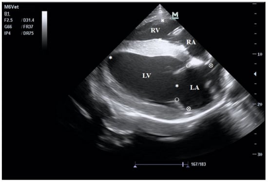 The echocardiogram was obtained at the fourth intercostal space on the right side, with the transducer pointing toward the fifth intercostal space on the left side. Measurements included the left ventricular long diameter (LVLD, ✱), right ventricular diameter (RVD, ×), mitral valve diameter (MVD, ○), and left atrial diameter (LAD, ⊗). RV: right ventricle; LA: left atrium; LV: left ventricle.