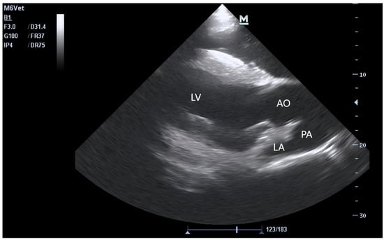 B-mode echocardiogram of the right parasternal long-axis view of the left ventricular outflow tract. PA: pulmonary artery, AO: aorta.