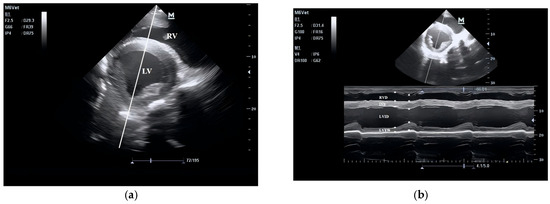 B-mode (a) and M-mode (b) echocardiogram of the right parasternal short-axis view.