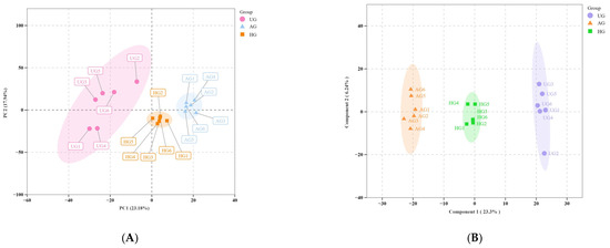 (A) PCA plots. PC1 represents the first principal component and PC2 represents the second principal component, and the percentage indicates the proportion of the data set explained by PC1 and PC2. Each point in the figure represents a sample, and samples from the same group are shown in the same color. Group refers to the grouping. (B) OPLS-DA score plots. The horizontal axis represents the predicted principal component, and the direction of the horizontal axis shows the gap between groups. The vertical axis represents the orthogonal principal component, and the direction of the vertical axis shows the gap within groups. The percentage indicates the interpretation rate of this component for the data set. Each point in the figure represents a sample, and samples within the same group are shown in the same color. “Group” indicates the grouping.