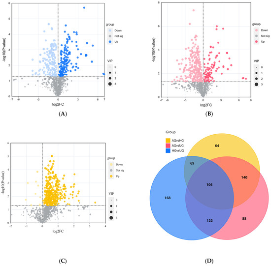 (A) HG vs. UG. (B) AG vs. UG. (C) AG vs. HG. Volcano plots of differential metabolites between groups. (D) Venn diagram of shared differential metabolites between AG vs. UG, HG vs. UG and AG vs. HG.