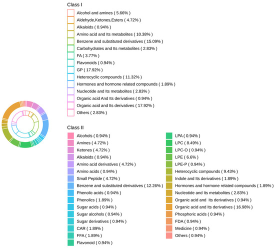 Further analysis revealed 106 shared differential metabolites among the three groups, and their classification information is shown in Figure 6. There were significant differences among the three groups with organic acid and derivatives being the most prevalent metabolite, GP being the second, and benzene and substituted derivatives being the third.