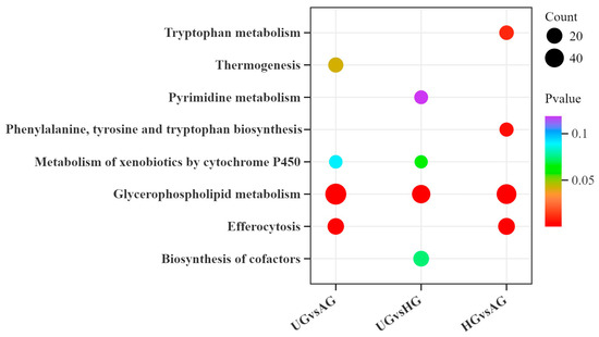 KEGG pathway enrichment analysis was performed based on the results of the differential metabolite analysis. The differential metabolites between AG and HG were mainly enriched in bile secretion, cofactor synthesis, and metabolic pathways. Between AG and UG, the differential metabolites were primarily enriched in glycerophospholipid metabolism, choline metabolism in cancer, and the one-carbon pool by the folate pathway. Between HG and UG, they were mainly enriched in pathways of glycerophospholipid metabolism, choline metabolism in cancer, and biosynthesis of unsaturated fatty acids. Thirty-seven metabolic pathways overlapped across the comparison groups, including 2-oxocarboxylic acid metabolism, arachidonic acid metabolism, and fatty acid degradation (Figure 7).