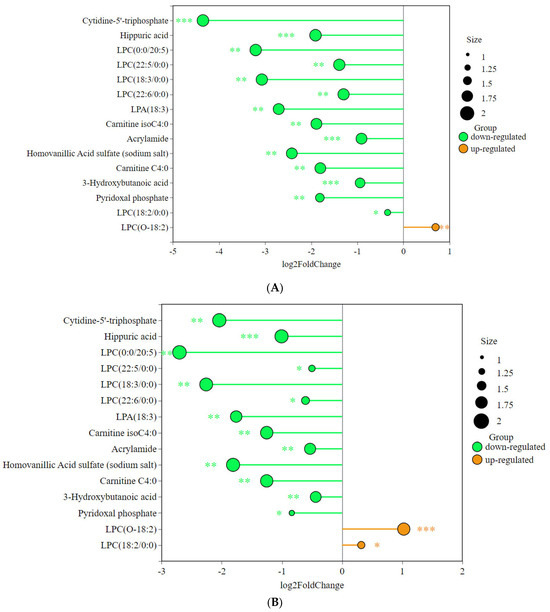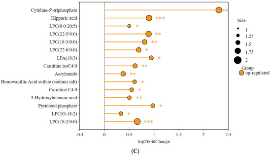 Differences in abundance of key metabolites among the three groups: (A) AG vs. UG, (B) HG vs. UG, and (C) HG vs. AG. (* p < 0.05, ** p < 0.01, *** p < 0.001).