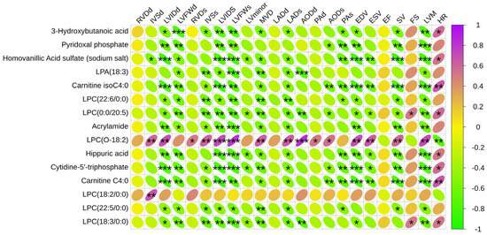 Correlation analysis between significantly different metabolites and structural function of the equine heart. Green is a negative correlation, red is a positive correlation, and the darker the color, the stronger the correlation. * p < 0.05, ** p < 0.01, *** p < 0.001.