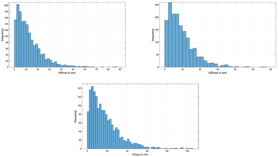 Histograms for absolute values of head movement symmetry measure differences for N = 256 horses contributing at least two data sets. (Top left): HDmin; (Top right): HDmax; and (Bottom): HDup. Horizontal (x) axes are scaled to accommodate the respective maximum values observed; bin width for all histograms: 2 mm.