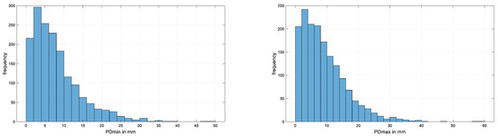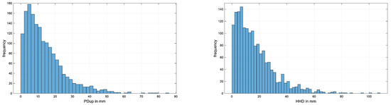 Figure 1 and Figure 2 present histograms for absolute values of differences between repeat measurements of head and pelvic movement symmetry measures from N = 256 Thoroughbred racehorses in active race training. For head movement, the 90th percentile of absolute movement symmetry differences between repeats were found to lie between 20 mm for HDmax and 37 mm for HDup (Table 5). For pelvic movement, the 90th percentile of absolute movement symmetry differences between repeats were found to lie between 13 mm for PDmin and 24 mm for PDup for midline pelvic movement and 30 mm for tuber coxae movement (HHD) (Table 5). The corresponding values for the 95th percentile are 23 mm (HDmax) and 49 mm (HDup) for head movement and 17 mm (PDmin), 30 mm (PDup), and 38 mm (HHD) for pelvic movement.