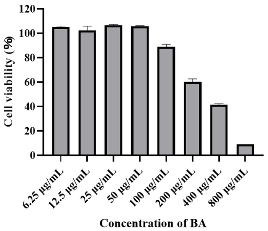 The cytotoxicity of baicalin to porcine peritoneal mesothelial cells. The cells were treated with 6.25–800 μg/mL of baicalin for 12 h. BA stands for baicalin.