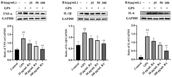 Baicalin inhibited the expression of inflammatory proteins in porcine peritoneal mesothelial cells infected with Glaesserella parasuis. Baicalin reduced the upregulation of TNF-α, IL-1β, and IL-6. GPS stands for Glaesserella parasuis; BA stands for baicalin; TNF-α stands for tumor necrosis factor alpha; IL-1β stands for interleukin-1 beta; IL-6 stands for interleukin-6; GAPDH stands for glyceraldehyde-3-phosphate dehydrogenase. Significant differences are denoted as follows: ## represents p < 0.01 for the comparison between the control group and the GPS infection group; * and ** represent p < 0.05 and p < 0.01, respectively, for the comparisons between the GPS infection group and the baicalin groups.