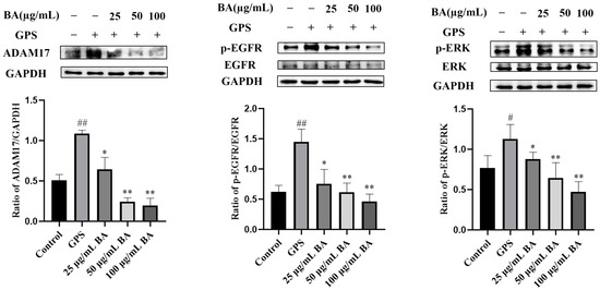 Baicalin inhibited the expression of ADAM17/EGFR axis-related proteins in porcine peritoneal mesothelial cells infected with Glaesserella parasuis. Baicalin reduced the upregulation of ADAM17, p-EGFR/EGFR, and p-ERK/ERK. GPS stands for Glaesserella parasuis; BA stands for baicalin; ADAM17 stands for disintegrin and metalloproteinase 17; EGFR stands for epidermal growth factor receptor; p-EGFR stands for phosphorylated EGFR; ERK stands for extracellular signal-regulated kinase; p-ERK stands for phosphorylated ERK; GAPDH stands for glyceraldehyde-3-phosphate dehydrogenase. Significant differences are denoted as follows: # and ## represent p < 0.05 and p < 0.01, respectively, for the comparisons between the control group and the GPS infection group; * and ** represent p < 0.05 and p < 0.01, respectively, for the comparisons between the GPS infection group and the baicalin groups.