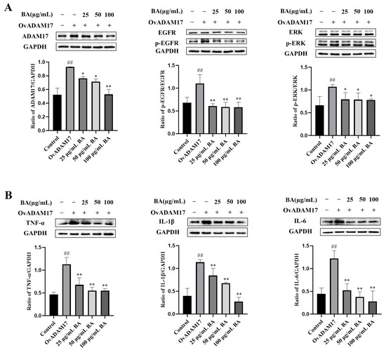 Baicalin inhibited the expression of ADAM17/EGFR axis-related proteins and inflammatory proteins induced by ADAM17 overexpression in porcine peritoneal mesothelial cells. (A) Baicalin reduced the upregulation of ADAM17, p-EGFR/EGFR, and p-ERK/ERK. (B) Baicalin reduced the upregulation of TNF-α, IL-1β, and IL-6. OvADAM17 stands for overexpression of ADAM17; BA stands for baicalin; ADAM17 stands for disintegrin and metalloproteinase 17; EGFR stands for epidermal growth factor receptor; p-EGFR stands for phosphorylated EGFR; ERK stands for extracellular signal-regulated kinase; p-ERK stands for phosphorylated ERK; TNF-α stands for tumor necrosis factor alpha; IL-1β stands for interleukin-1 beta; IL-6 stands for interleukin-6; GAPDH stands for glyceraldehyde-3-phosphate dehydrogenase. Significant differences are denoted as follows: ## represents p < 0.01 for the comparison between the control group and the OvADAM17 group; * and ** represent p < 0.05 and p < 0.01, respectively, for the comparisons between the OvADAM17 group and the baicalin groups.