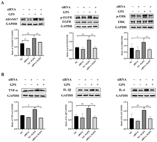 ADAM17 small interfering RNA (siRNA) inhibited the expression of ADAM17/EGFR axis-related proteins and inflammatory proteins in porcine peritoneal mesothelial cells infected by Glaesserella parasuis. (A) ADAM17 siRNA reduced the upregulation of ADAM17, p-EGFR/EGFR, and p-ERK/ERK. (B) ADAM17 siRNA reduced the upregulation of TNF-α, IL-1β, and IL-6. NC stands for negative control siRNA; siRNA stands for ADAM17 siRNA; GPS stands for Glaesserella parasuis; ADAM17 stands for disintegrin and metalloproteinase 17; EGFR stands for epidermal growth factor receptor; p-EGFR stands for phosphorylated EGFR; ERK stands for extracellular signal-regulated kinase; p-ERK stands for phosphorylated ERK; TNF-α stands for tumor necrosis factor alpha; IL-1β stands for interleukin-1 beta; IL-6 stands for interleukin-6; GAPDH stands for glyceraldehyde-3-phosphate dehydrogenase. Significant differences are denoted as follows: # and ## represent p < 0.05 and p < 0.01, respectively, for the comparisons between the negative control siRNA group and the negative control siRNA plus GPS group; * and ** represent p < 0.05 and p < 0.01, respectively, for the comparisons between the corresponding negative control siRNA and ADAM17 siRNA groups, both in the presence and absence of GPS infection.