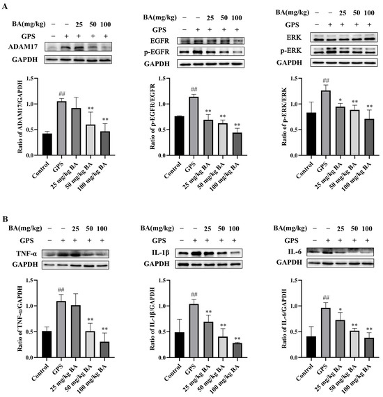 Baicalin alleviated inflammatory protein expression via the ADAM17/EGFR axis in the peritoneum of piglets infected with Glaesserella parasuis. (A) Baicalin reduced the upregulation of ADAM17, p-EGFR/EGFR, and p-ERK/ERK. (B) Baicalin reduced the upregulation of TNF-α, IL-1β, and IL-6. GPS stands for Glaesserella parasuis; BA stands for baicalin; ADAM17 stands for disintegrin and metalloproteinase 17; EGFR stands for epidermal growth factor receptor; p-EGFR stands for phosphorylated EGFR; ERK stands for extracellular signal-regulated kinase; p-ERK stands for phosphorylated ERK; TNF-α stands for tumor necrosis factor alpha; IL-1β stands for interleukin-1 beta; IL-6 stands for interleukin-6; GAPDH stands for glyceraldehyde-3-phosphate dehydrogenase. Significant differences are denoted as follows: ## represents p < 0.01 for the comparison between the control group and the GPS challenge group; * and ** represent p < 0.05 and p < 0.01, respectively, for the comparisons between the GPS challenge group and the baicalin treatment groups.