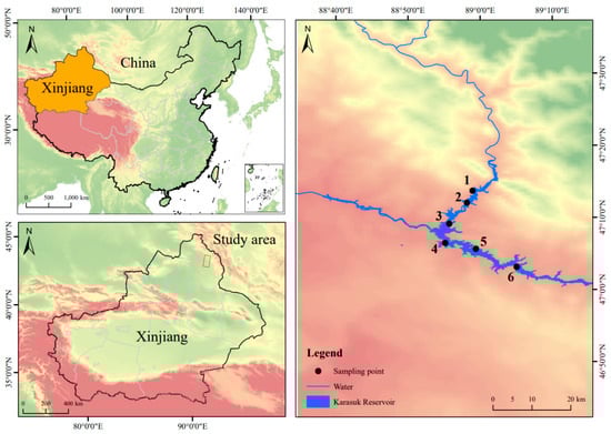 Distribution map of sampling points in the Kalasuke Section of the Irtysh River. Points 1 to 6 represent six different sampling sites, and each sampling site is at least 2 km apart from the others.