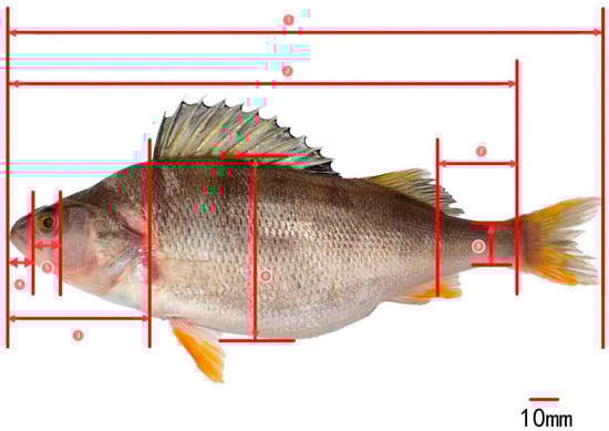 Morphological measurement of Perca fluviatilis—1: total length; 2: body length; 3: head length; 4: snout length; 5: eye diameter; 6: body depth; 7: caudal peduncle length; 8: caudal peduncle height.