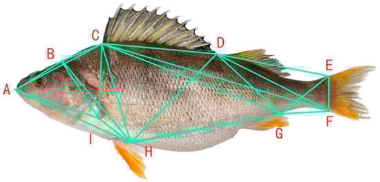 For the framework morphology measurement (Figure 3), coordinate points were selected following the method of Sifa Li et al. []. The coordinate points were A, B, C, D, E, F, G, H, and I, respectively. By connecting these representative coordinate points, a total of 24 framework distances were set (Figure 2 and Figure 3), namely A-B, B-C, C-D, D-E, E-F, F-H, H-I, A-I, A-C, C-I, C-H, C-F, D-I, D-H, E-H, D-F, and H-G. Among them, A-B is the distance from the tip of the snout to the back of the occiput, B-C is the distance from the back of the occiput to the origin of the dorsal fin, and so on [].