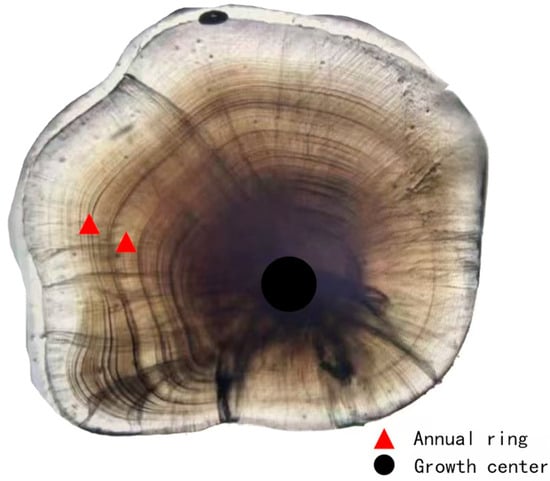 The age of P. fluviatilis was determined using sagittal otoliths (Figure 4) []. A pair of sagittal otoliths was removed from each P. fluviatilis, embedded in nail polish, and left to set for 12 h. The otoliths were then polished in a circular motion with 5000-grit sandpaper, with regular microscopic observation during the process []. Once the polishing reached the central region of the otolith, the otolith was flipped, and the procedure was repeated on the other side. When clear annual rings became visible, they were observed, counted under a microscope, photographed, and preserved. The age was determined through blind inspection by 2–3 observers. Microscopic observation revealed that each otolith annulus consisted of a transparent zone and a dark zone. In most otoliths, the marginal area had formed the growth dark zone of the next annulus; therefore, these otoliths were assigned to the next age class and recorded as integers. For example, individuals with a growth stage of 1+ were recorded as age 2, those with 2+ were recorded as age 3, and so on [,,].