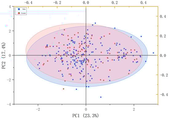 After excluding perch individuals of indeterminate sex, a principal component analysis (PCA) was performed on the ratios of 14 measurable morphological traits. The contribution rates of the first three principal components were calculated as follows (Table 3): PC1 (23.29%), PC2 (17.35%), and PC3 (14.81%), with a cumulative contribution rate of 55.45%.