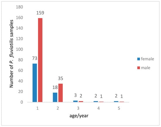 A total of 296 P. fluviatilis specimens were obtained for age estimation. The population age was composed of 1–5 years old, with the dominant age groups being 1–2 years old, accounting for 96.2% of the total samples. Among them, 1-year-old individuals were the most numerous, accounting for 78.3%, while older fish were fewer. This indicates (Figure 6) that the age structure of the population is relatively simple and shows a trend of younger age.