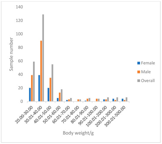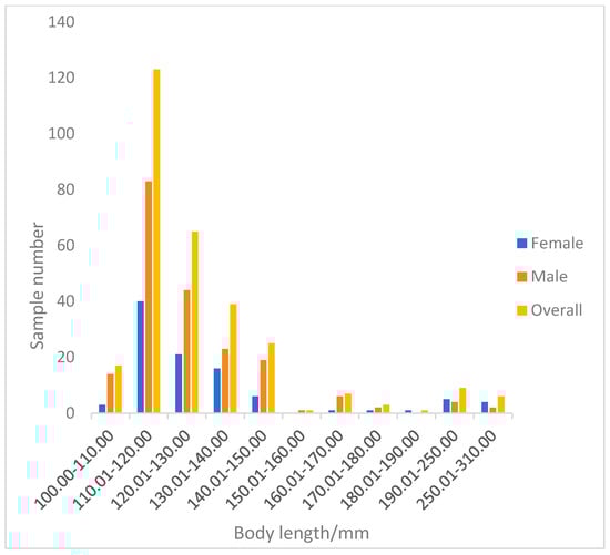 A total of 296 perch specimens were measured. The total length of perch ranged from 100.53 to 305.30 mm, with an average of 130.23 ± 29.63 mm. The dominant length was 100.53–150.00 mm, accounting for 90.09% of the total samples (Figure 7). The body mass ranged from 24.20 to 490.20 g, with an average of 52.65 ± 62.53 g. The dominant body mass group was below 66.5 g, accounting for 89.86% of the total samples (Figure 8).